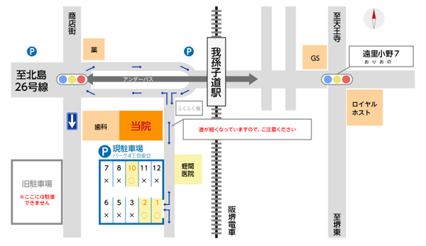 当院の専用駐車場は下記地図記載の「パーク4丁目安立」の1・2・10番です。こちらの駐車場に空きがない場合は近隣の駐車場に停めて頂きますよう宜しくお願い致します。
